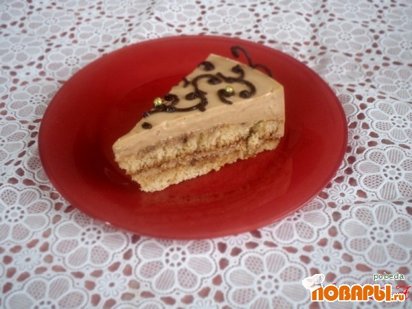 На дно разъёмной формы для торта ложим первый корж, на него 1/3 часть крема и ложим второй корж. Затем к оставшемуся крему добавляем белково-желатиновый раствор, хорошо перемешиваем и готово суфле. Выливаем суфле поверх второго коржа и ставим в холодильник на застывание.