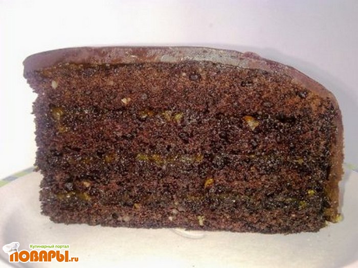 Готовый корж вынуть, оставить на созревание на 8 часов. Затем разрезать на слои толщиной 1-1,5 см. Смазать горячим абрикосовым джемом. Соединить. Сверху залить горячей шоколадной глазурью.