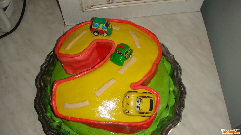 Сборка. Первый бисквит разрезаем на 3 коржа и промазываем 1-м кремом. Сверху и по бокам обмазываем кремом масло+сгущенка. Из 2-ого коржа вырезаем цифру 2, и делим ее на 2 коржа, промазываем взбитыми сливками, выкладывая порезанные консервированные персики. Также обмазываем кремом масло+сгущенка. Далее покрываем зеленой мастикой нашу основу, аккуратно цифру 2 переносим, на нашу основу и также украшаем мастикой, цвета выбираем по желанию. Приятного аппетита!
