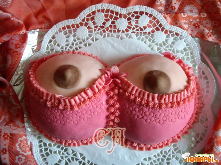 Выпечь один корж на протвине с бортиками. После его остывания, прикладываем форму будущей "груди", это может быть пиала или чашка нужной формы, и вырезаем два круга. Это будет основание торта.