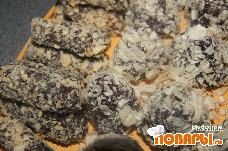 Отщипывать от массы кусочки и формировать конфетки, обваливая в крошке вафли или орехах, или какао порошке.