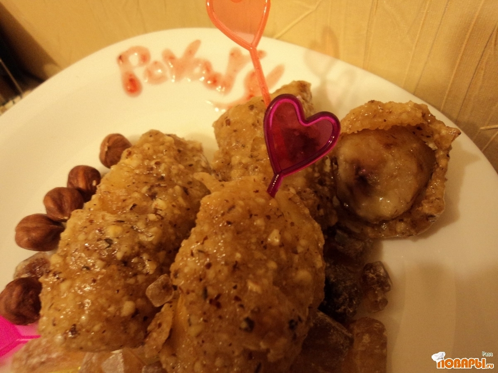 Обмакиваем насаженный на вилку банан и быстро кидаем в ледяную воду. Достаем бананчики в карамельке и даем немного подсохнуть. Приятного аппетита.