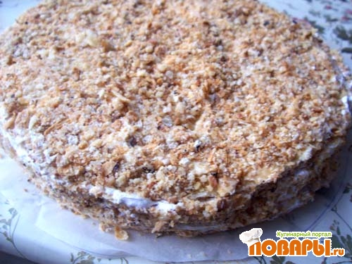 Коржи после выпечки подровнять. Смазать кремом и присыпать крошкой, которую сделать из обрезков.