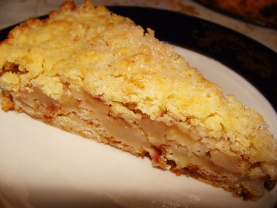 Готовим тесто: муку, сахар, яичные желтки и маргарин смешиваем и растираем руками, так чтобы образовалась мучная крошка. Крошку делим попалам. На дно насыпаем половину мучной крошки, выкладываем яблочную начинку, сверху присыпаем опять мучной крошкой.