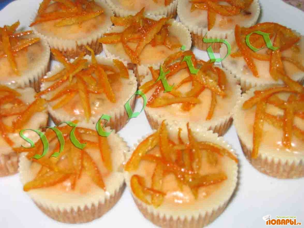 апельсин очистить от кожи, пленок и косточек, порезать небольшими кусочками (одна долька на три части). засыпать апельсин крахмалом, хорошо и аккуратно перемешать. в форму для выпекания положить бумажные формочки, заполнить на 1/2 тестом. положить в центр кусочек апельсина