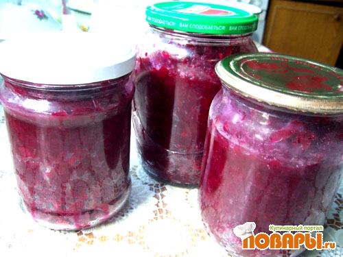 Все тщательно перемешиваем, раскладываем в банки и заливаем горячим маринадом. Банки стерилизуем: 0,5 литра - 15 минут, литровые - 25 минут.