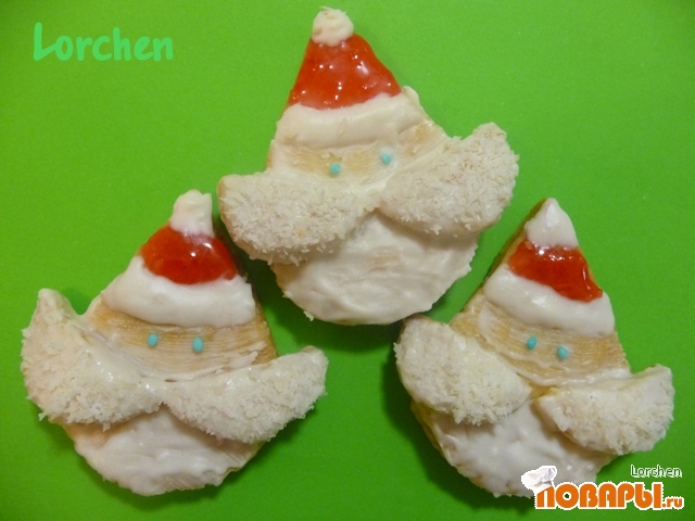 Растопить белый шоколад в микроволновке - разукрасить наших Морозов. Усы посыпать кокосовой стружкой.