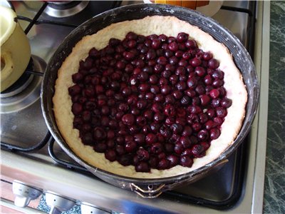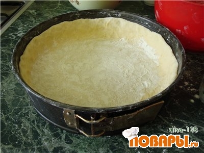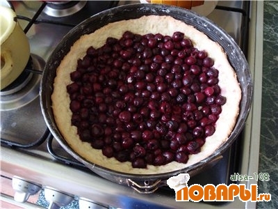 форму посыпаю мукой, выкладываютесто тонким слоем и с высокими бортиками, чтобы вишневый сок не вытек