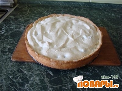 когда тесто почти готово, выкладываю поверх вишни взбитые белки, но не касаюсь бортиков формы! обратно в духовку на 10-15 мин