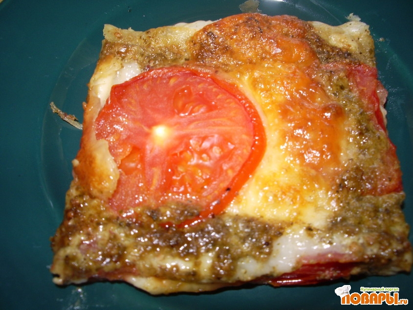 Выкладываем в шахматном порядке моцареллу и помидоры. Сверху накладываем сеточку из соуса песто. Запекаем минут 30 в разогретой до 200 градусов духовке.