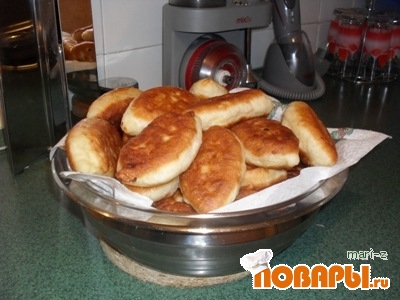Тесто оставляем остывать до тёплого состояния (градусов до 40-50 С). Затем в него добавляем дрожжи, 4 ст.ложки муки и перемешиваем. Оставшуюся муку высыпаем на стол, выкладываем на него тесто и тщательно вымешиваем до состояния, когда оно начнёт отставать от рук. Оно не должно быть плотным. От готового теста отрываем небольшие кусочки, из которых затем формируем пирожки, закладывая в них начинку. Жарить в сковороде WOK.