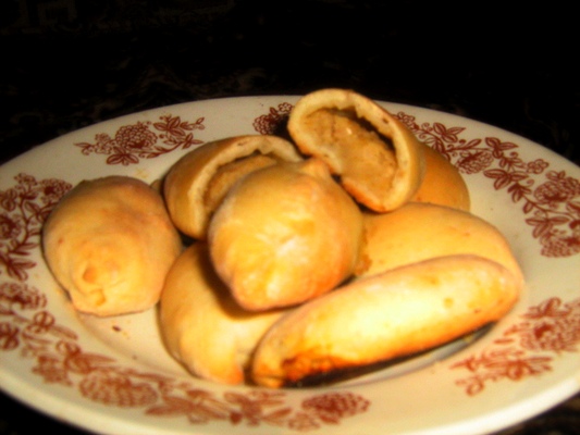 Все ингредиенты для теста смешиваем, и добавляем муку пока тесто не станет пригодным для раскатки. Делим тесто на равные кусочки (я поделила на 24, люблю тоненькое тесто в пирожках). Каждый кусочек раскатываем, в серединку кладем совершенно остывшую начинку.