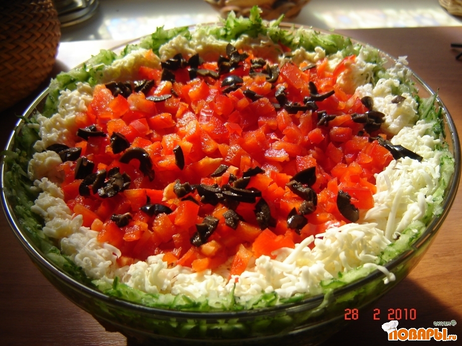 Теперь меленько порезать красный перец, засыпать им салат, оставляя "корку" не тронутой. Из маслин нарезать "косточки" и притрусить ими салат.