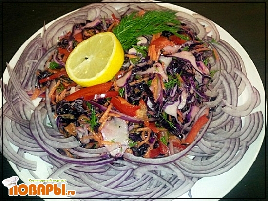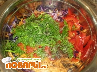 На той же тёрке,что использовали для капусты, натрите перец и красный лук. Добавьте в капусту перец, сок половинки лимона, мелко нарезанный укроп, чёрный перец, соль и оливковое масло.