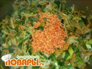 Обжарить не сильно лук репчатый с луком пореем, добавить морковь, через некоторое время промытую чечевицу и картофель. Нужно дать немного подрумяниться картофелю, но не дать пригореть. Добавляем кипяток и оставляем варится до разваривания чечевицы.