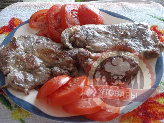 Маринад: в стакане смешать винный уксус, оливковое масло, соль и перец по вкусу и залить мясо, поставить на 40 минут, а затем обжарить.