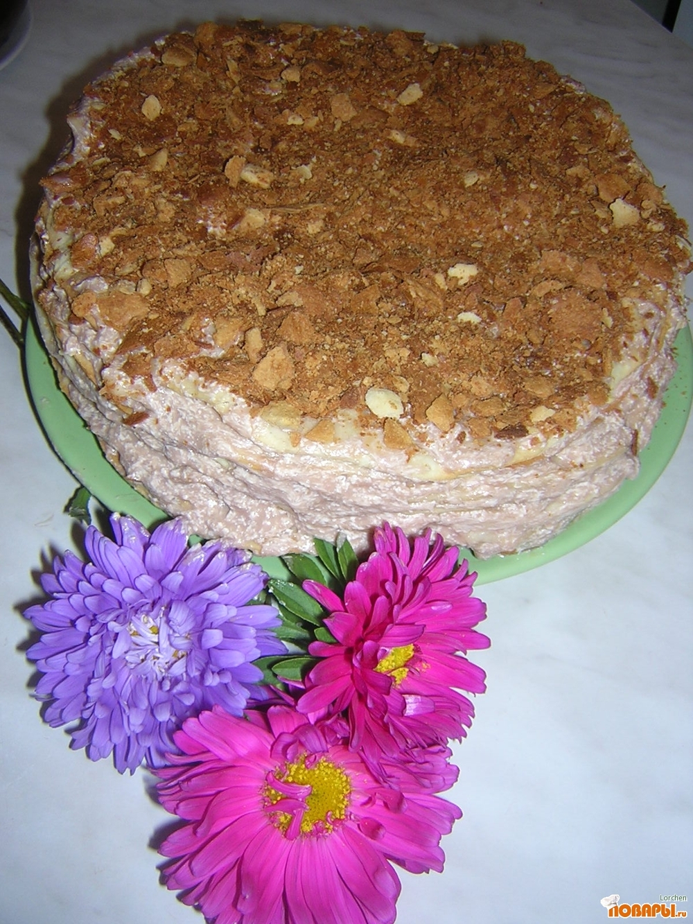 Остывшие коржи смазать кремом и обсыпать торт крошкой.