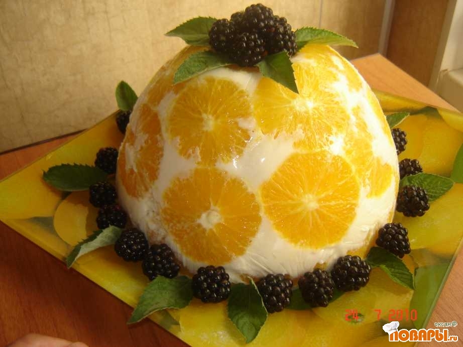 Круглую салатницу выстлать пищевой пленкой и выложить апельсиновыми кружочками. Затем на дно салатницы выложить часть бисквита, персиков и залить йогуртом, потом снова - бисквит - персики - йогурт и так, пока не закончится салатница)))))))). Последним слоем должен быть бисквит, залитый йогуртом.