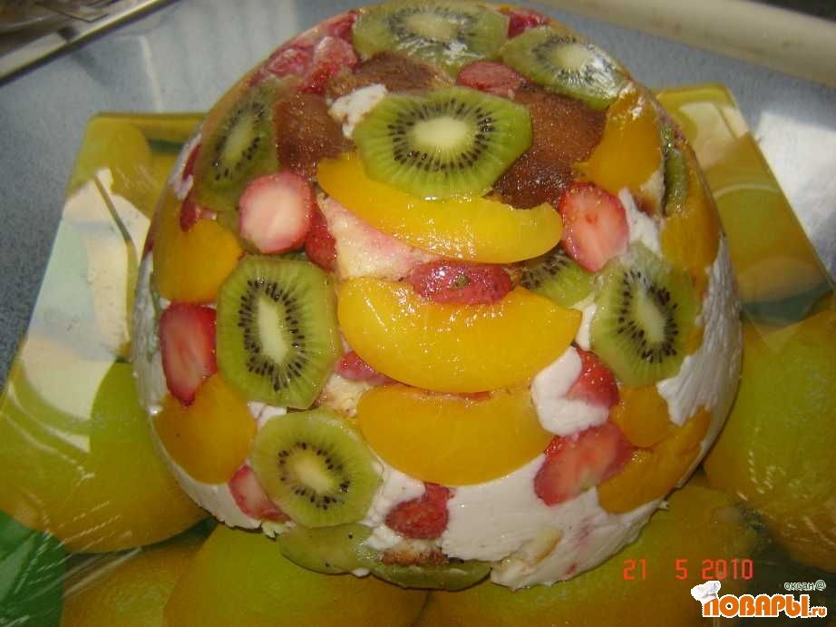 Ввести в желатин сметанную массу тоненькой струйкой, постоянно помешивая. Застелить глубокую посуду пищевой пленкой, на дно выложить нарезанные на половинки ягоды клубники и киви, затем - слой поломанного на кусочки бисквита, вылить половину сметанной массы, опять слой ягод и слой бисквита, сметанную массу.