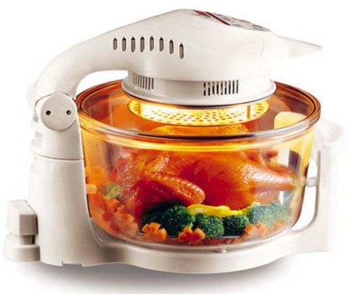 В эту самую колбу помещаются продукты, закрываются крышкой и можно включать прибор. Вентилятор начинает нагнетать воздух, который проходит через нагреватель и подается на продукты, свободно циркулируя внутри колбы. При этом нет никакой надобности переворачивать или помешивать продукты во время процесса готовки - в аэрогрилях реализован принцип конвекции, что способствует идеальному пропеканию любых продуктов. Также при приготовлении блюд в аэрогриле отсутствует необходимость использовать масло или жиры, поскольку еда практически не пригорает, а это несомненно большой плюс не только для приверженцев здорового образа жизни, а вообще для всех.