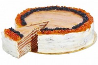 И удивительный закусочный торт из блинчиков, приготовленных на основе лосося и анчоусов, прослоенный сливочным сыром и зеленью, и украшенный двумя видами лососевой икры: красной и черной.