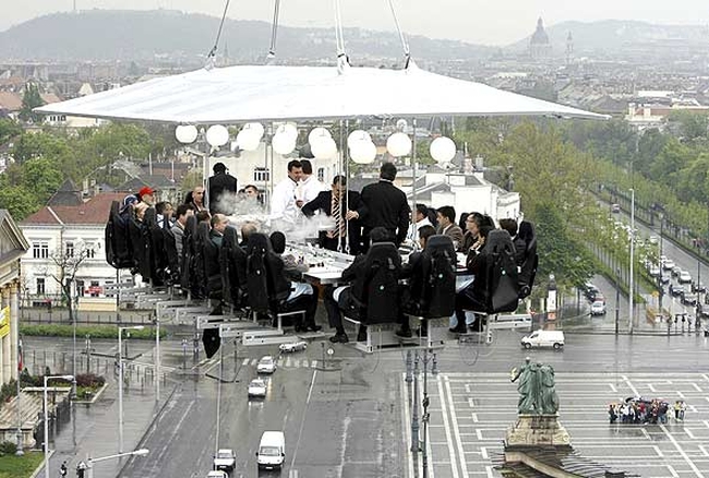 В бельгийской столице появился диковинный ресторан с многообещающим англоязычным названием Dinner in the Sky Обед на небесах. Меню здесь предлагают только после того, как клиент, усевшись за стол, надежно пристегнется к стулу ремнем. Таково правило техники безопасности ведь во время обеда пассажиры ресторана висят над землей на 50-метровой высоте. Собственно, весь персонал заведения шеф-повар, один официант и аниматор действует на небольшой площадке, которую поднимает в воздух мощный подъемный кран, великолепная круговая панорама гостям обеспечена. На борту ничего лишнего, не нашлось места даже для туалетных кабинок, но ведь по-настоящему высокая кухня требует жертв... Гастрономический аттракцион не собирается надолго задерживаться в Брюсселе его владельцы рассчитывают на большое количество заказов от компаний, организующих корпоративные обеды и вечеринки по всему миру.