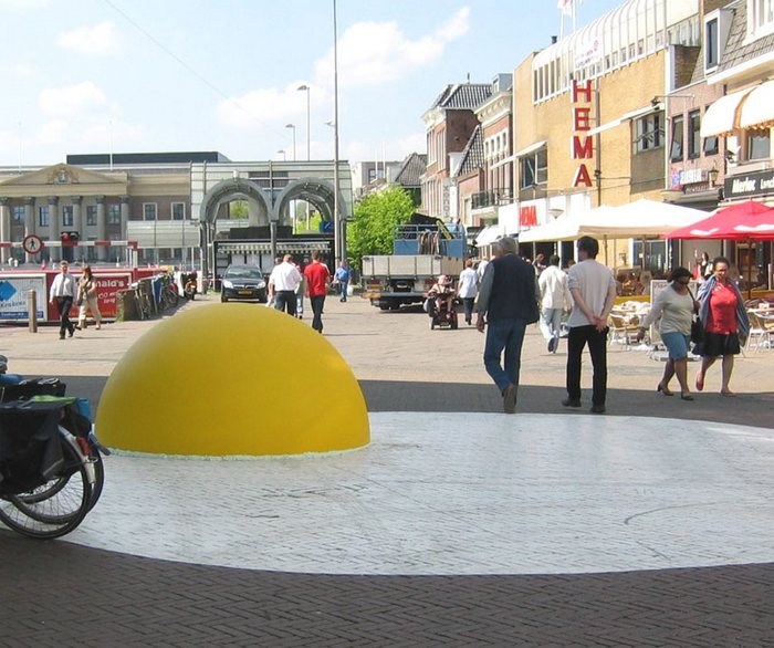 В северном городе Голландии - Леувардене - на одной из крупнейших площадей талантливый дизайнер и художник Хенк Хофстра (Henk Hofstra) «поджарил» аппетитную яичницу-глазунью из 8-ми огромнейших яиц, превратив улицу в импровизированную сковородку и реализовав тем самым свой арт-проект под названием «Art-Eggcident».