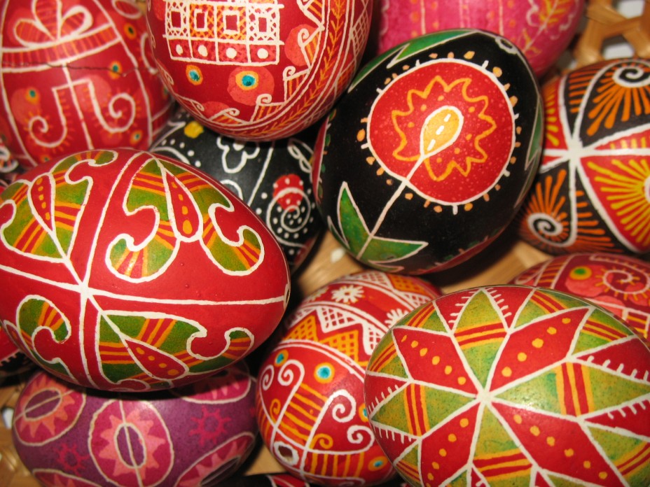 Писанки. Писанки - это куриные яйца, которые расписывают специально к Пасхе. По технике исполнения орнамента всё множество писанок разделяется на несколько видов. Наиболее простой способ заключается в украшении всей поверхности яйца цветными точками или пятнышками. Ещё один несложный способ состоит в процарапывании узора на равномерно окрашенном яйце. Остальные способы связаны со сложным колористическим и композиционным решением, их освоение требует знания хотя бы элементарных орнаментов и элементов, а также владения традиционными техническими приёмами.Самый известный из них - это восковой способ. Он требует специального инструмента - кистки - конусообразной трубочки, прикреплённой к деревянной ручке, чтобы инструмент было удобно держать во время работы (иногда попросту обходятся гвоздиком или палочкой). Поверхность писанок в воображении или системой линий можно разбить на определенное количество участков (фрагментов) регулярной формы. Это связано с особенностями художественного решения миниатюр на яйце. Все декоративные элементы размещаются внутри участков или на пересечении линий и создают орнаментальные мотивы. Если элементы располагаются симметрично, образуется статичный, уравновешенный орнамент. Если же возникает асимметрия, орнамент приобретает динамичный характер. На основе ограниченного количества композиционных схем народные мастера создавали и продолжают создавать неограниченное количество художественных композиций.Народный художник (мастер) не сразу создаёт произведение: он обдумывает замысел, а затем воплощает его. Каждый художественный образ имеет свои особенности, связанные со спецификой материала и способов его обработки. Яйцо хрупкое, маленькое и при этом объёмное. Поэтому его нужно держать в руках очень осторожно и во время работы поворачивать, чтобы видеть со всех сторон. Это помогает увидеть их как объёмные изделия, занимающие определённое место в трёхмерном пространстве, - причём увидеть во всей красоте и каждый раз по-новому, в зависимости от точки зрения. Писанки своими руками восковым способомВосковой способ состоит в последовательном нанесении орнамента на яйцо с помощью растопленного воска и нескольких красителей.