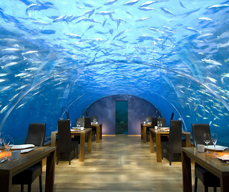 Расположенный в природном раю Мальдивских островов ресторан Ithaa, является первым подводным рестораном, который позволяет своим посетителям насладиться трапезой и наблюдать красивый подводный пейзаж одновременно. Ресторан находится на уровне 5 метров ниже уровня моря, и предлагает своим клиентам 270 градусный панорамный вид на коралловый риф. В Ithaa могут разместиться одновременно только 14 человек в то время, поэтому места там бронируются заранее. Это будет стоить вам до 300 долларов, но об этом невозможно пожалеть.