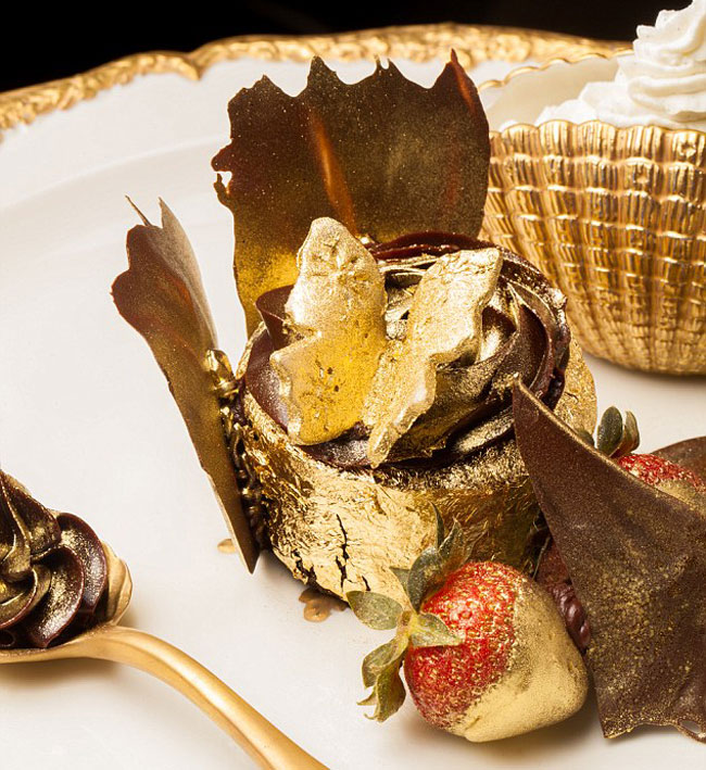 Несложно догадаться, что для выпечки пирожного использовались только самые дорогие продукты: съедобное золото (на 23 карата в целом, что-то около 4,6 грамма), бьющая по карману английская мука от Doves, органическое сливочное масло от Rachels, итальянское какао Premium Amedei Porcelena, золотая ваниль из Уганды.