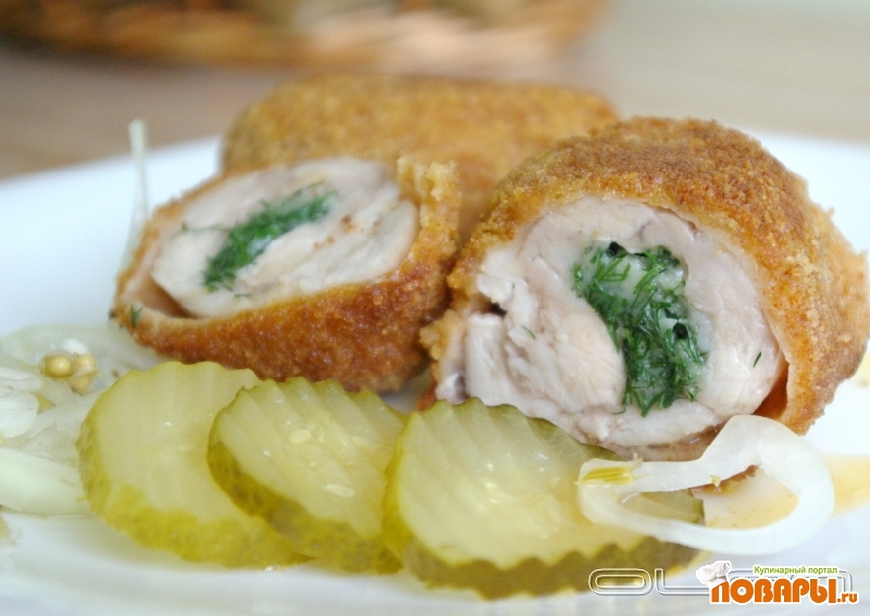 В серединку положить кусочек масла. Завернуть, обвалять в муке, обмакнуть в яйца, взбитые с молоком, затем в панировочные сухари, опять в яйца и повторно в сухари