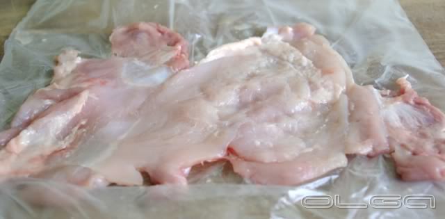 Куриные ножки разрезать на две части - голень и бедрышко. Вынуть косточки, аккуратно помогая острым маленьким ножиком. Снять кожу и также отбить.