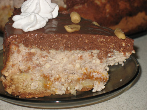 Взбить желтки с сахаром и творогом, добавить сметану, шоколад и желатин. В конце вмешать взбитые в пену белки.