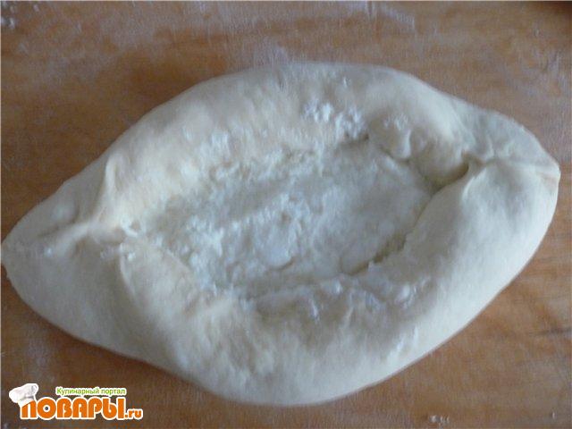 Готовое тесто разделить на 4 части. Сформировать из каждого шар и раскатать его, придав овальную форму. Поверх теста выложить начинку,