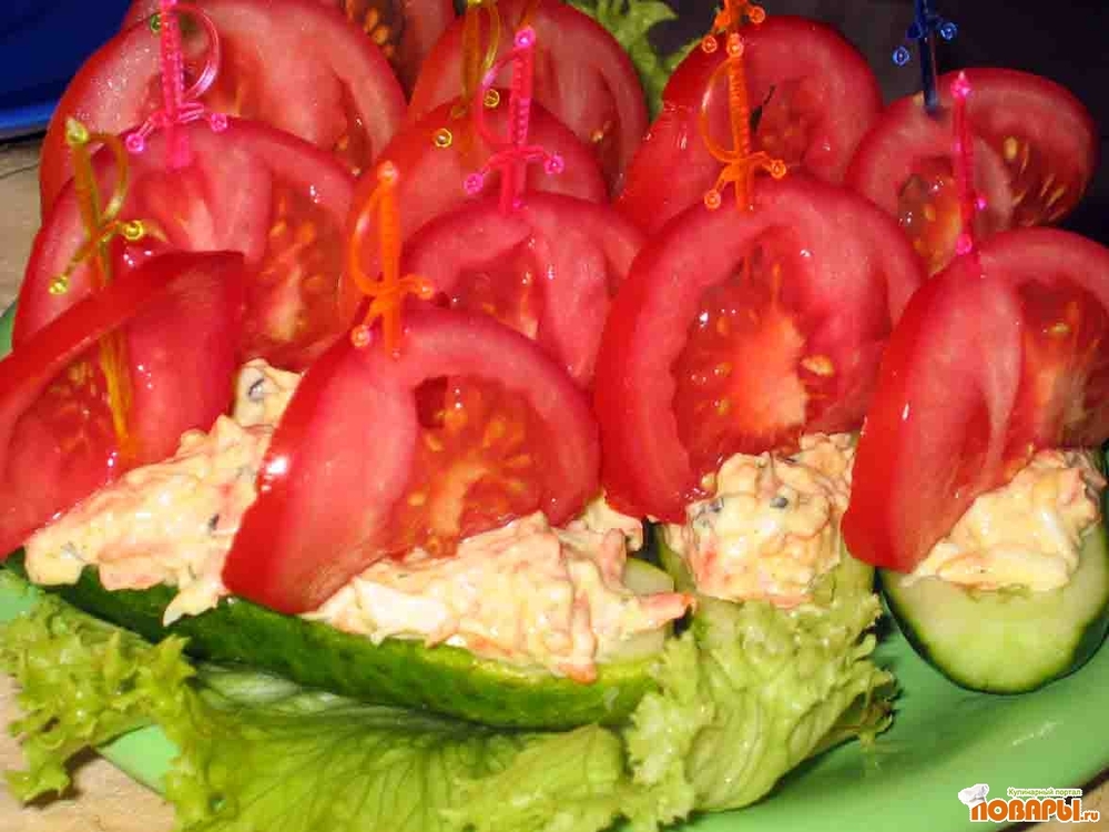 Уложить огурцы на листья салата, наполнить начинкой. разрезать пополам помидоры, нарезать тоненькие пластинки, из которых сформировать парус, укрепив его шпажкой или зубочисткой на огуречной лодочке