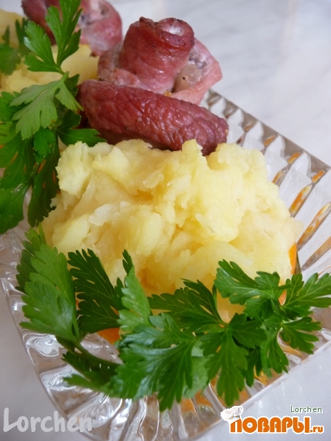 Картофель отчистить, сварить. Сделать пюре, добавив туда свежевыжатый сок одного апельсина и сливочное масло.