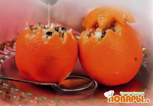 Срежьте верхушки апельсинов, извлеките мякоть и мелко нарежьте ее.