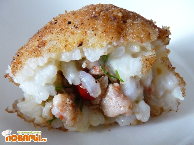 Рис отварить в подсоленной воде, добавить сливочное масло и мелко натертый сыр. Одно яйцо взбить и соединить с рисовой массой, хорошо размешать. Смочить руки водой, взять горстку риса объемом с куриное яйцо и размять на ладони. В середину положить 1 ч. л. мясной начинки и сформовать шарик. Так же приготовить все аранчини.