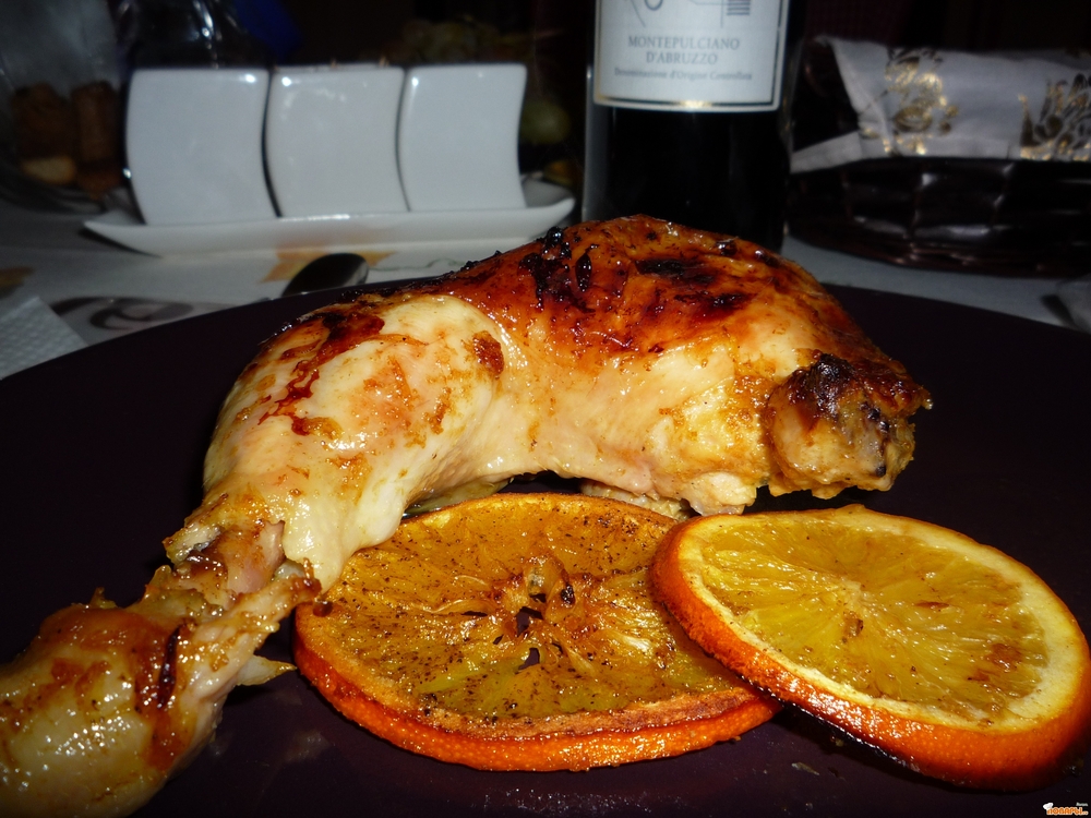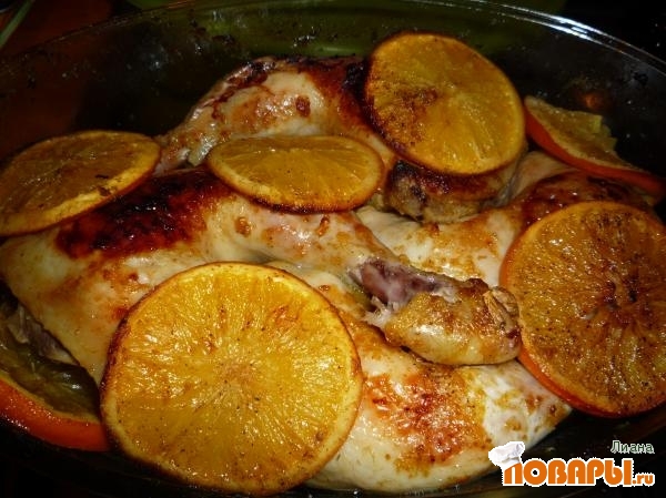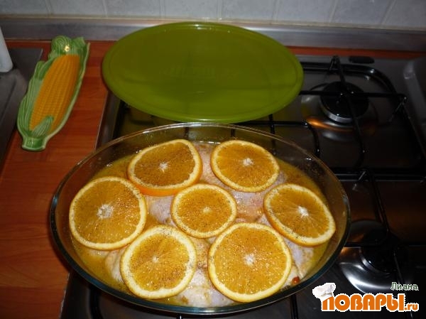 Подержи в прохладном месте не менее часа, периодически встряхивая. Затем выкладывай замаринованные кусочки в форму, на них выложи кружки апельсина и запекай минут 50 ( а то и больше, курица должна быть сильно зажарена) при 180 градусах. Не забывай периодически поливать маринадом оставшимся. Я расходую весь маринад.