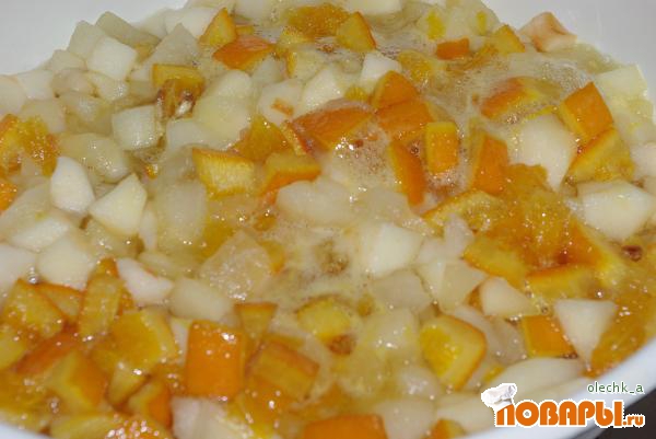 Добавить яблоки в сироп с апельсинами и варить на маленьком огне до готовности яблок.