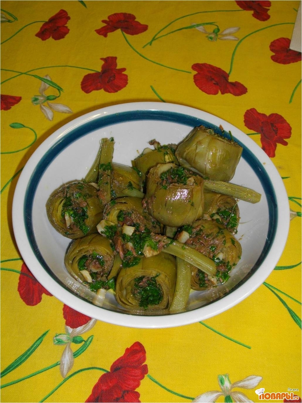 Через пару минут всыпьте рубленую петрушку и порезанные анчоусы. Солить не надо, так как анчоусы очень соленые. Подержите массу пару минут на огне. В серединку каждого бутона положите соус и уложите на блюдо. Остатки соуса вылейте поверх. Дайте остыть и подавайте к столу.