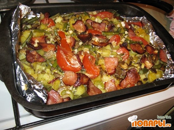 Вмешать в картофель стручковую фасоль, грибы, помидоры, сельдерей. Ветчину выложить по верху. Слегка посыпать зелёным луком, добавить пару зубчиков чеснока.