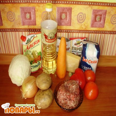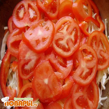 После картофеля приходить очередь моркови, перца, лука, капусты, помидор. Капуста, перец – соломкой, морковь, помидоры – кружочками, лук – полукольцами.