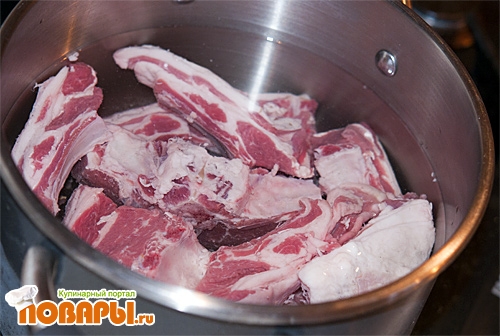 Берем небольшого размера кастрюлю, раскладываем в ней наши бараньи косточки с мясом, заливаем холодной водой так, что бы только покрыть содержимое кастрюли.