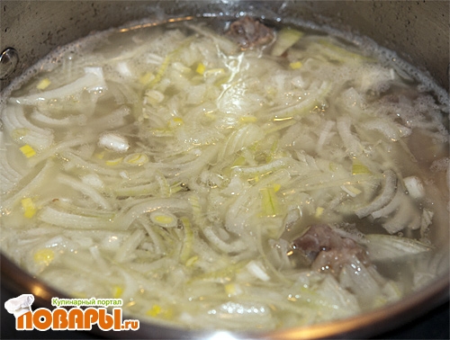 Медленно доводим до кипения, периодически снимая пену. Как закипит - убавим огонь до минимума, но так, что бы бульон дальше кипел, только очень слабо и закроем крышкой. Варим 50 минут.