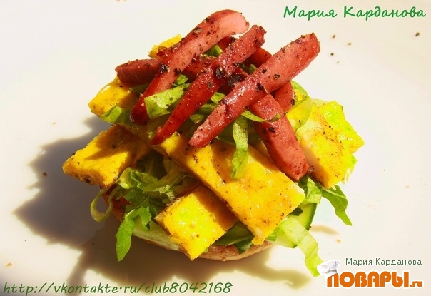 На каждую булочку кладём огурец по всей поверхности в 2 слоя крест на крест, далее по 1 ч.л. майонеза, затем на него приклеиваем салат, сверху выкладываем полоски омлета, ещё салат, сосисочки и посыпаем перцем!