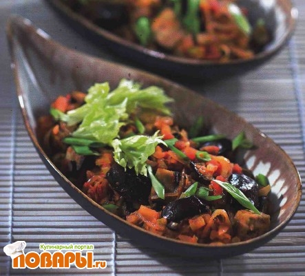 Добавьте помидоры вместе с соком, лимонный сок, сахар и измельченные маслины. Готовьте, время от времени помешивая, 10 мин. Выложите баклажаны, накройте форму крышкой или фольгой и держите еще 10 мин. Зеленый лук тонко нарежьте и посыпьте готовое блюдо. Подавайте горячим или остывшим.