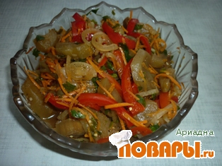 Отжать с баклажанов жидкость, обжарить на растительном масле 3 - 4 мин. Выложить на салат, перемешать, закрыть крышкой и дать салату постоять в холодильнике.