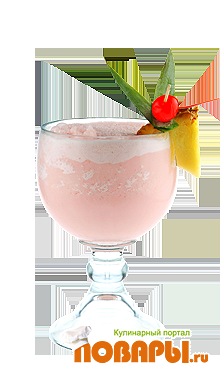 Перелей в чашу и укрась долькой ананаса и коктейльной вишней
