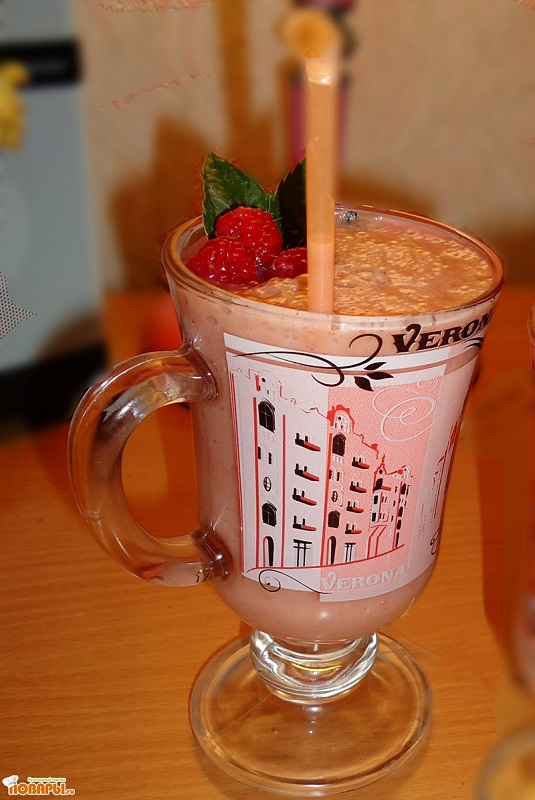 Все это тщательно взбиваем в блендере, разливаем по стаканам и красиво украшаем ягодками малины и листочками мяты.